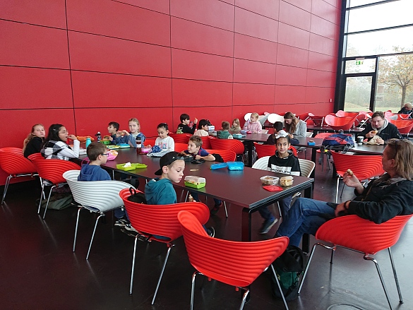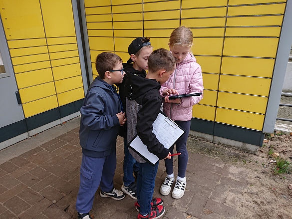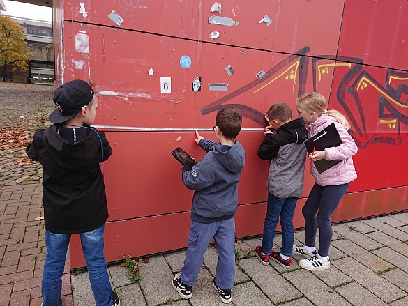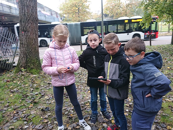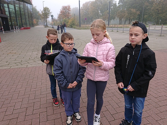 Nach der Pause in der Uni lösten wir ausgestattet mit Ipad zur Orientierung, Maßband, Stoppuhr und Klemmbrett mit Stift in Kleingruppen Matheaufgaben auf dem Campus. Von diesem Mathetrail waren alle Kinder begeistert! Es war ein schöner Herbsttag und gut gelaunt fuhren wir wieder zur Schule.